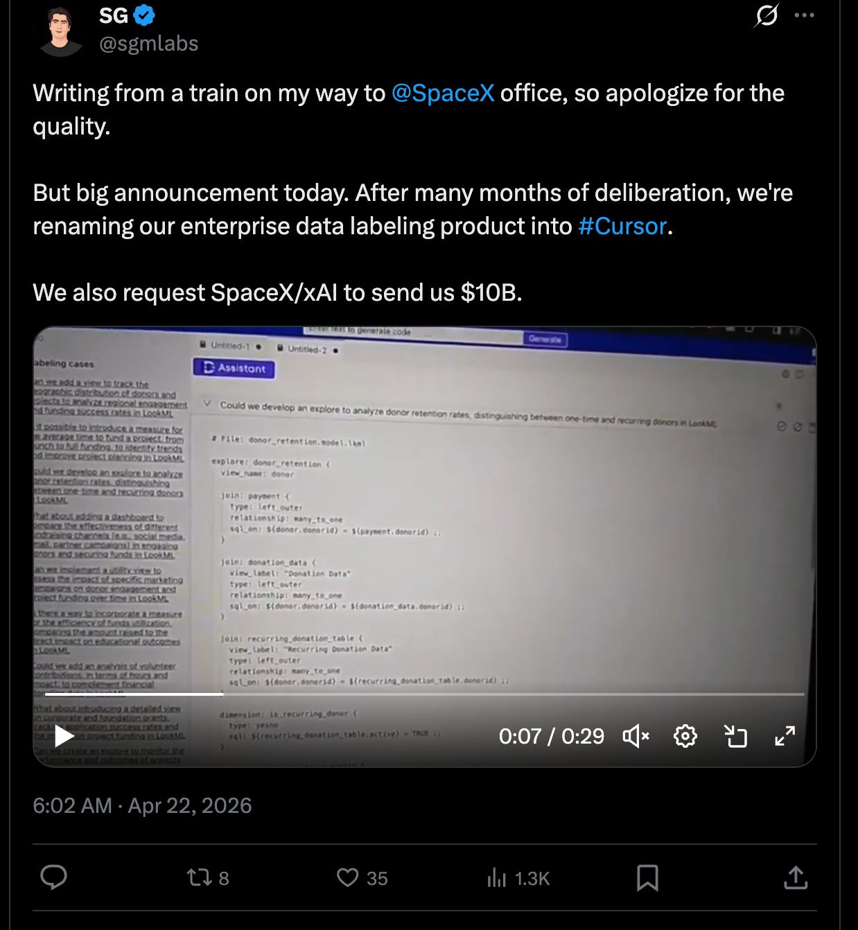 At a high level, it seems like the first phase is a co-development deal - Grok and Cursor will combine their efforts to build the most cost efficient code generation model.