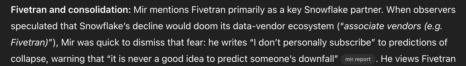 Taking into account all of the above, I could not shake the feeling that I no longer see the Fivetran <> dbt merger as something that can have a significant impact on the future. We might actually be at a pivotal moment in history that these tools risk becoming irrelevant. Even industry leaders like Snowflake acknowledge the shift – calling themselves an ‘AI data cloud’ – but, as Amplify notes, that’s often ‘bolting new marketing onto old architectures’. Fivetran/dbt merger could prove no different.