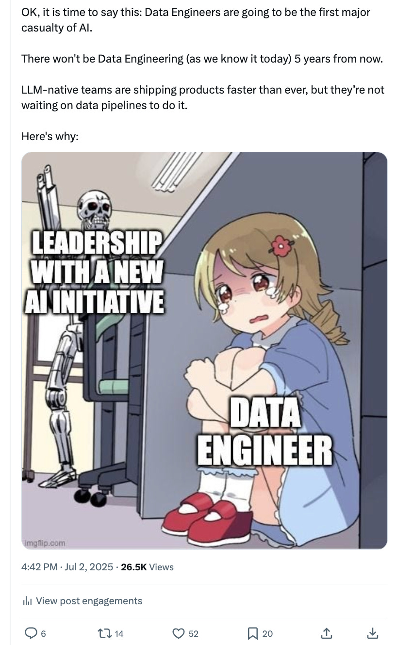 But even more importantly, it is highly unclear what is the future of traditional data engineers? That’s a post for another time. For now, a picture will do (via x.com/@klabsintexas):