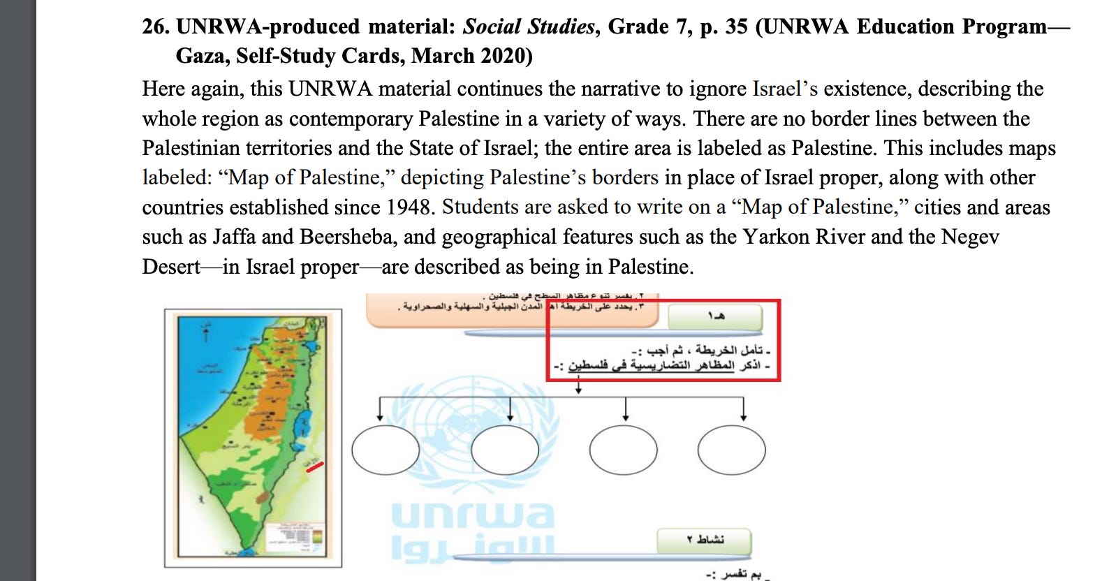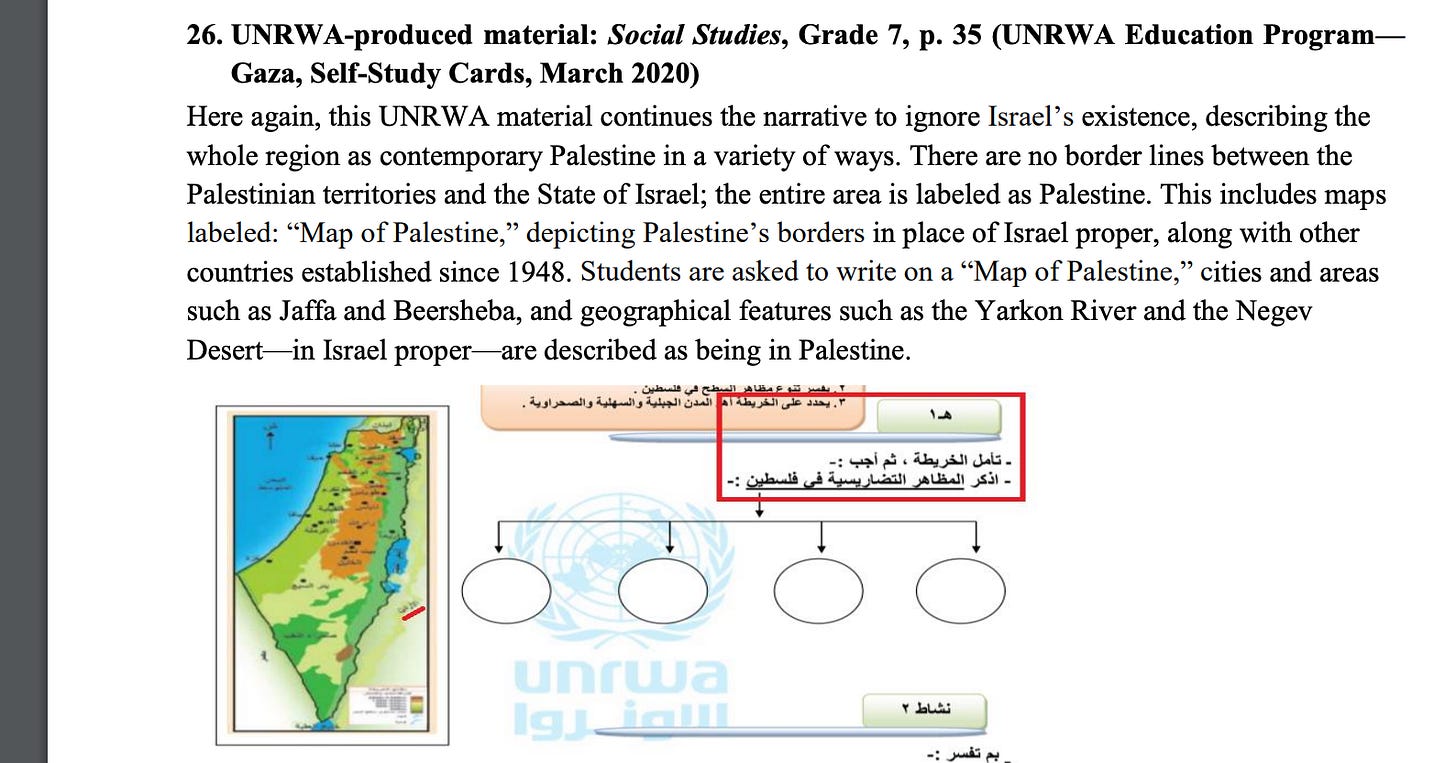 UNRWA Education: Reform or Regression describes 47 cases of incitement by UNRWA staff through various platforms and materials taught in classrooms in violation of the agency’s stated policies (i.e. zero tolerance for racism, discrimination, or anti-Semitism).